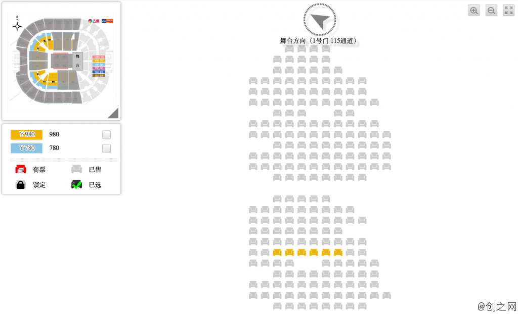我们都知道,普通票务网站会将门票分为看台、场地两个区域,并按票价区分座位;不同价格的座位会用不同颜色标明。而 SeatGeek 采取了不同策略。它整合了美国 700 多个场馆的座位图,其中许多场馆还提供 3D 视角图,相当于基本覆盖了美国主流市场。当用户在网站上选择某一场演唱会并查看细节时,SeatGeek 同样会列出整个场区座位图,但是。。咦,貌似有什么不一样。。