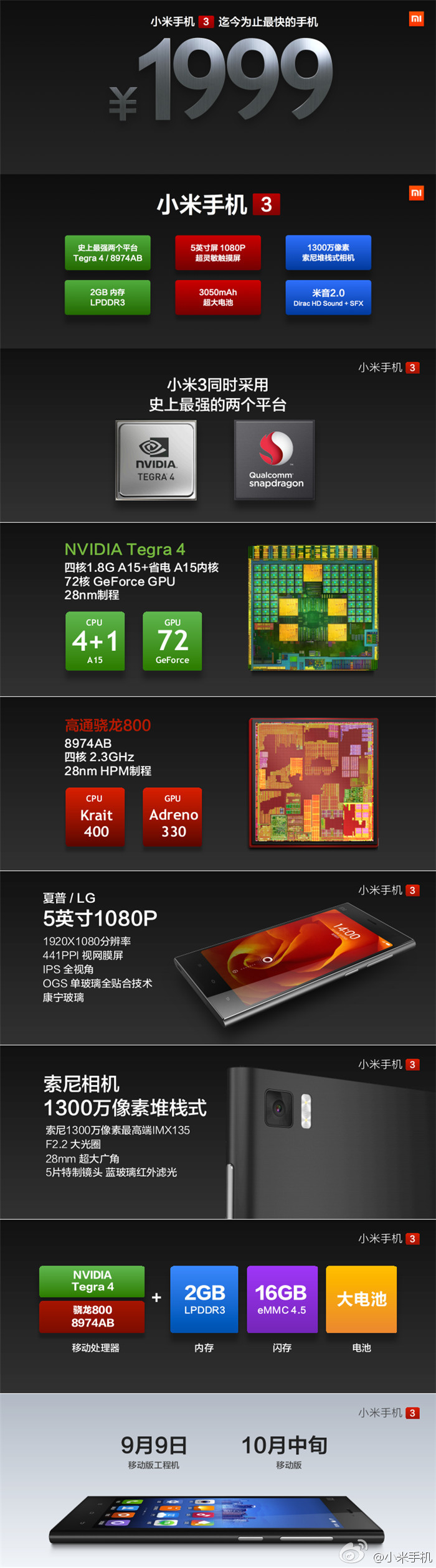 移动版采用英伟达 Tegra 4 四核 1.8GHz,联通电信版采用高通骁龙处理器四核 2.3GHz。2G 内存,5 英寸 1080P 屏幕,PP1 441,1300 万像素摄像头,带 NFC,售价 1999 元,10 月中旬移动版上市。